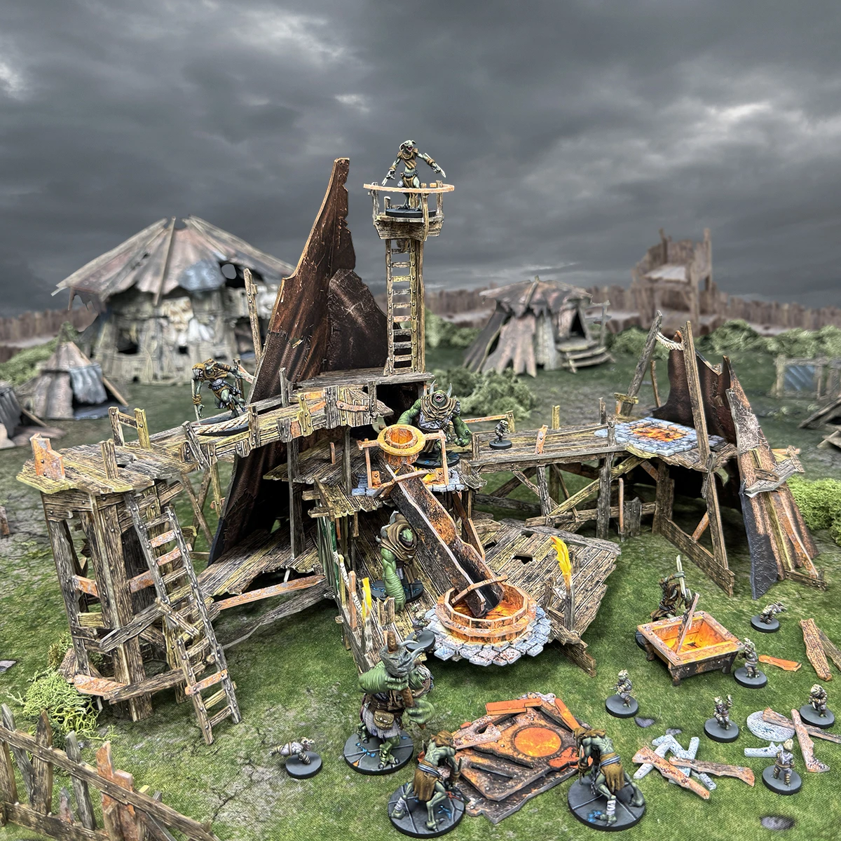 Questo set include una fonderia e officina rudimentale, utilizzata dai razziatori barbari per forgiare le loro armi e armature grezze. Comprende una serie di impalcature a più livelli sormontate da un nido di corvo, oltre a ripari coperti di pelli di animali per lo stoccaggio. Le vasche, i crogioli, le fornaci e i canaletti colmi di metallo fuso incandescente aggiungeranno un tocco di colore alla tua tavola da gioco.